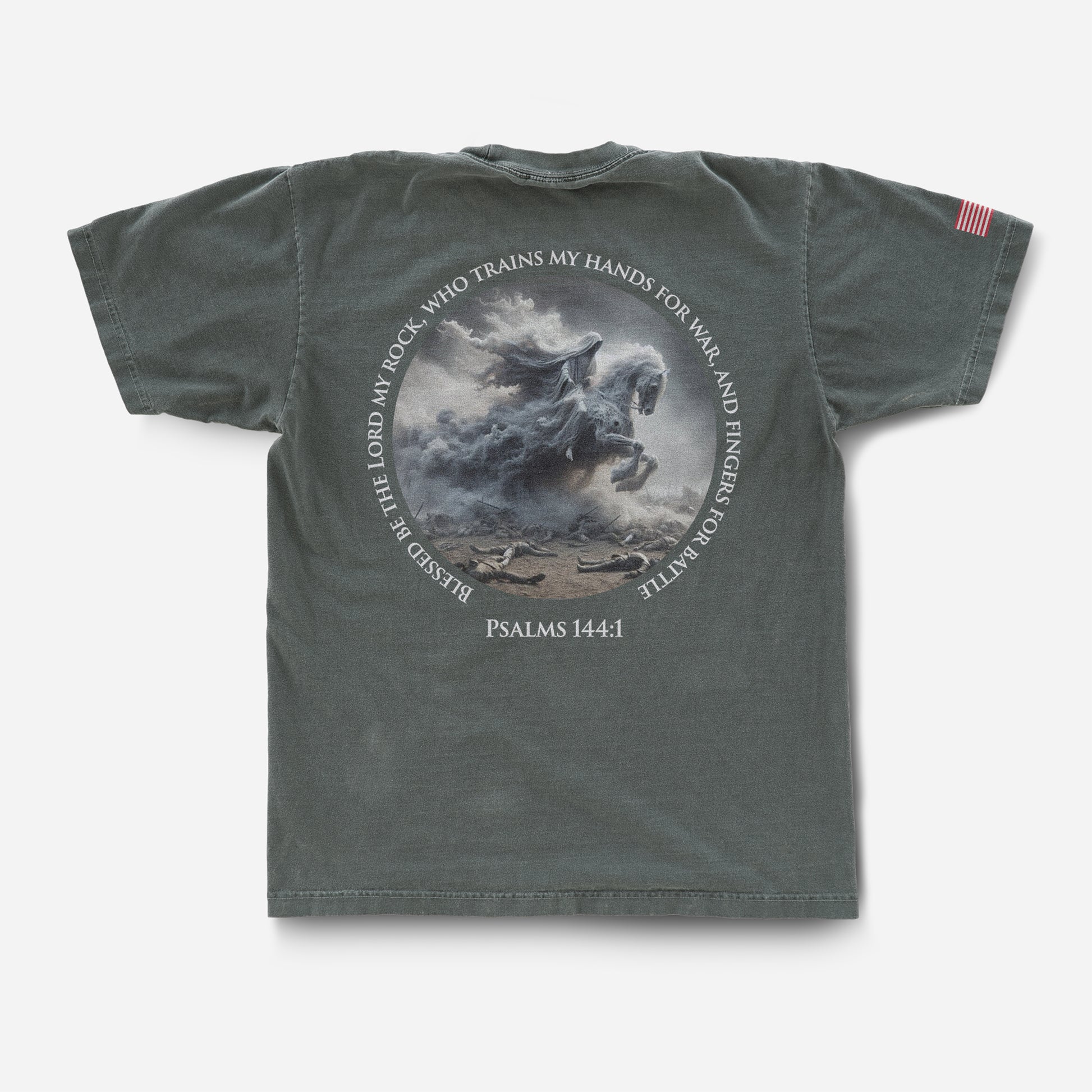 Equip yourself with Psalm 144:1 as you "Prepare for Battle." Made in the USA, this shirt features the ghostly Pale Horse Rider and a bible verse, embodying our love for Christ and our founding ideals. Inspire others and showcase your beliefs with this unique design. Order now! MADE IN THE USA